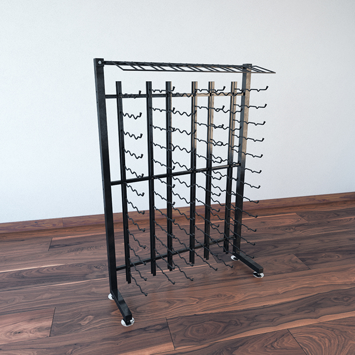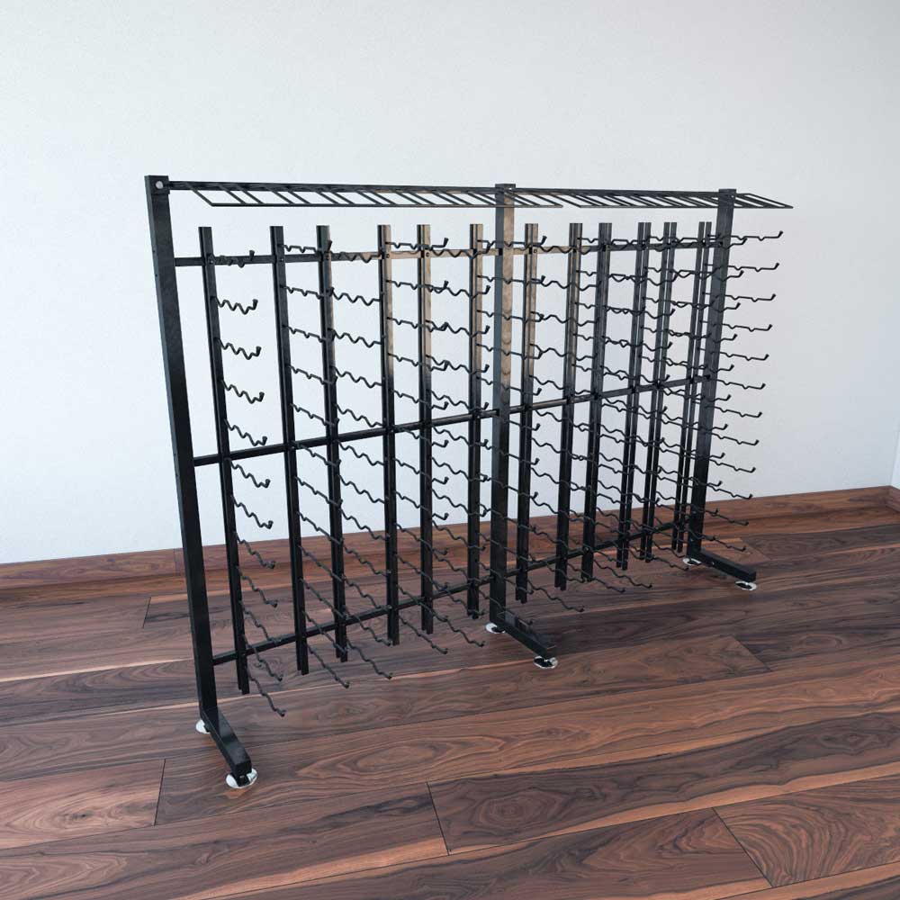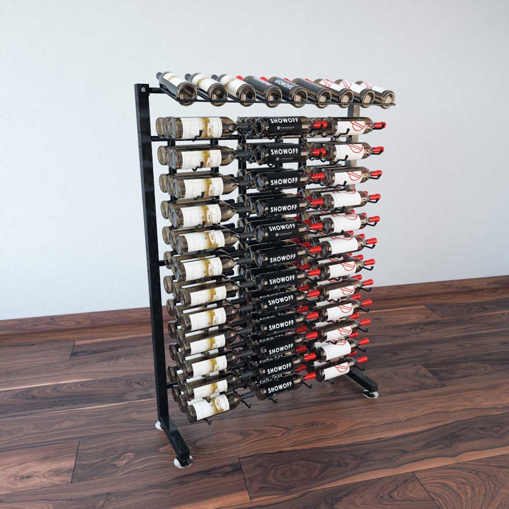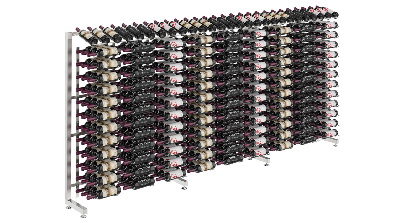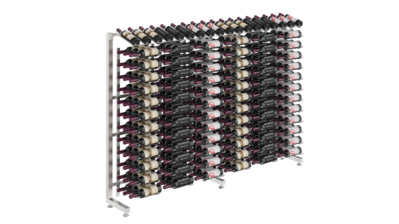 This one-sided version of the IDR4 shows off, label-forward, 117, 234 or 351 750ml wine bottles to line a beautiful retail space. At more than 4-feet in height, it fills the wall well with a mix of bottles in label-forward and presentation row configuration, all constructed of commercial grade steel to last a lifetime (literally).